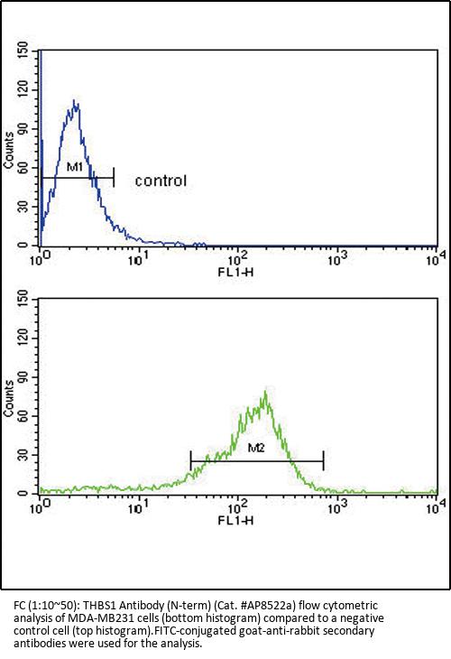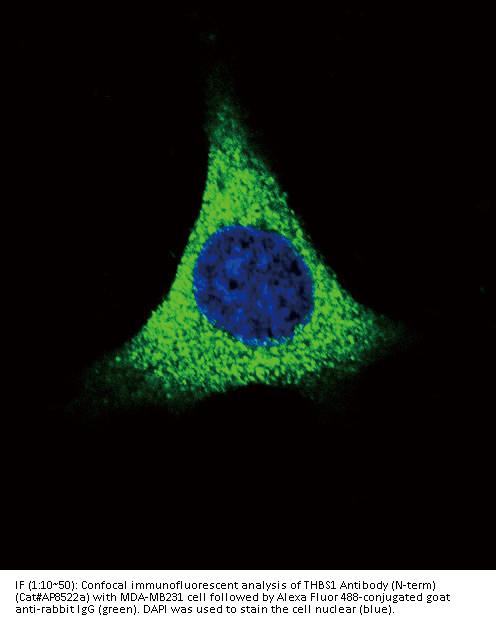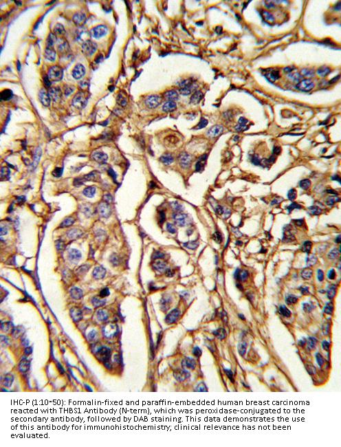 This THBS1 antibody is generated from rabbits immunized with a KLH conjugated synthetic peptide between 181-210 amino acids from the N-terminal region of human THBS1.