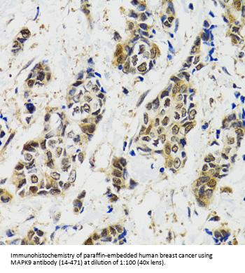 The protein encoded by this gene is a member of the MAP kinase family. MAP kinases act as an integration point for multiple biochemical signals, and are involved in a wide variety of cellular processes such as proliferation, differentiation, transcription regulation and development. This kinase targets specific transcription factors, and thus mediates immediate-early gene expression in response to various cell stimuli. It is most closely related to MAPK8, both of which are involved in UV radiation induced apoptosis, thought to be related to the cytochrome c-mediated cell death pathway. This gene and MAPK8 are also known as c-Jun N-terminal kinases. This kinase blocks the ubiquitination of tumor suppressor p53, and thus it increases the stability of p53 in nonstressed cells. Studies of this gene's mouse counterpart suggest a key role in T-cell differentiation. Several alternatively spliced transcript variants encoding distinct isoforms have been reported.