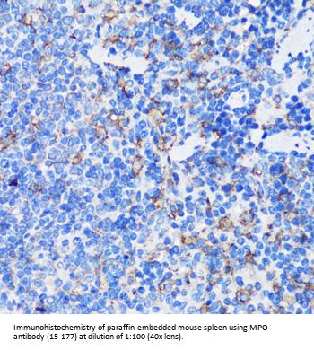 Myeloperoxidase (MPO) is a heme protein synthesized during myeloid differentiation that constitutes the major component of neutrophil azurophilic granules. Produced as a single chain precursor, myeloperoxidase is subsequently cleaved into a light and heavy chain. The mature myeloperoxidase is a tetramer composed of 2 light chains and 2 heavy chains. This enzyme produces hypohalous acids central to the microbicidal activity of neutrophils.