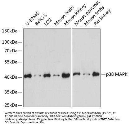 A synthetic peptide corresponding to a sequence within amino acids 300 to the C-terminus of human p38 MAPK (NP_620581.1).