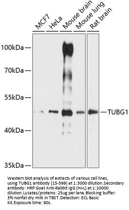 A synthetic peptide corresponding to a sequence within amino acids 350-450 of human TUBG1 (NP_001061.2).