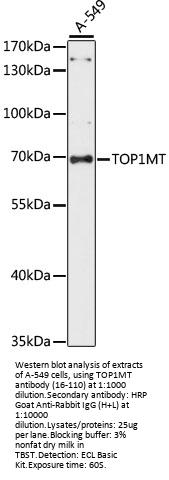 Recombinant fusion protein containing a sequence corresponding to amino acids 470-550 of human TOP1MT (NP_443195.1).