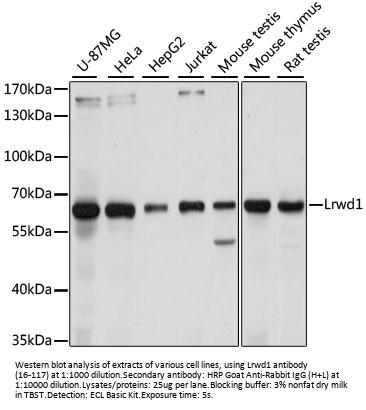 A synthetic peptide corresponding to a sequence within amino acids 250-350 of human Lrwd1 (NP_690852.1).