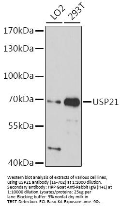 A synthetic peptide corresponding to a sequence within amino acids 400-500 of human USP21 (NP_001014443.1).