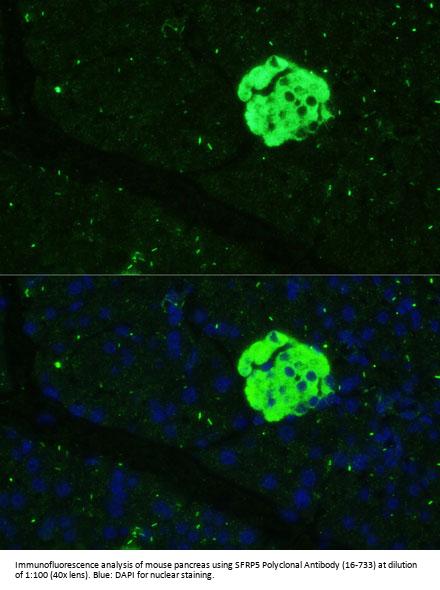 Secreted frizzled-related protein 5 (SFRP5) is a member of the SFRP family that contains a cysteine-rich domain homologous to the putative Wnt-binding site of Frizzled proteins. SFRPs act as soluble modulators of Wnt signaling. SFRP5 and SFRP1 may be involved in determining the polarity of photoreceptor cells in the retina. SFRP5 is highly expressed in the retinal pigment epithelium, and moderately expressed in the pancreas.