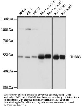 This gene encodes a class III member of the beta tubulin protein family. Beta tubulins are one of two core protein families (alpha and beta tubulins) that heterodimerize and assemble to form microtubules. This protein is primarily expressed in neurons and may be involved in neurogenesis and axon guidance and maintenance. Mutations in this gene are the cause of congenital fibrosis of the extraocular muscles type 3. Alternate splicing results in multiple transcript variants. A pseudogene of this gene is found on chromosome 6.
