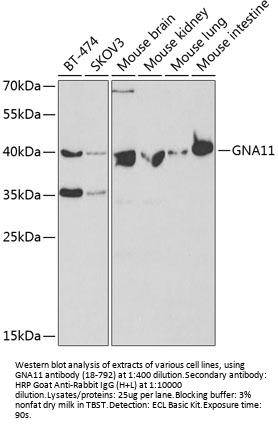 The protein encoded by this gene belongs to the family of guanine nucleotide-binding proteins (G proteins), which function as modulators or transducers in various transmembrane signaling systems. G proteins are composed of 3 units: alpha, beta and gamma. This gene encodes one of the alpha subunits (subunit alpha-11). Mutations in this gene have been associated with hypocalciuric hypercalcemia type II (HHC2) and hypocalcemia dominant 2 (HYPOC2). Patients with HHC2 and HYPOC2 exhibit decreased or increased sensitivity, respectively, to changes in extracellular calcium concentrations.