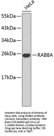 The protein encoded by this gene is a member of the RAS superfamily which are small GTP/GDP-binding proteins with an average size of 200 amino acids. The RAS-related proteins of the RAB/YPT family may play a role in the transport of proteins from the endoplasmic reticulum to the Golgi and the plasma membrane. This protein shares 97%, 96%, and 51% similarity with the dog RAB8, mouse MEL, and mouse YPT1 proteins, respectively and contains the 4 GTP/GDP-binding sites that are present in all the RAS proteins. The putative effector-binding site of this protein is similar to that of the RAB/YPT proteins. However, this protein contains a C-terminal CAAX motif that is characteristic of many RAS superfamily members but which is not found in YPT1 and the majority of RAB proteins. Although this gene was isolated as a transforming gene from a melanoma cell line, no linkage between MEL and malignant melanoma has been demonstrable. This oncogene is located 800 kb distal to MY09B on chromosome 19p13.1.