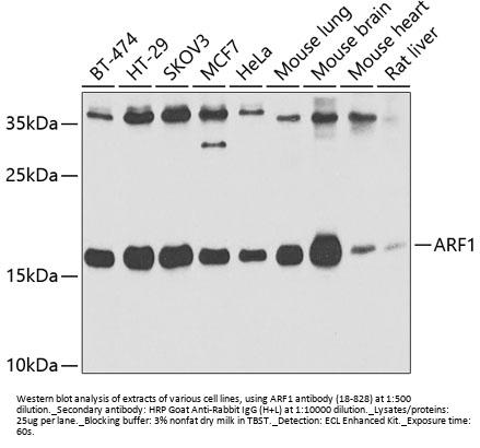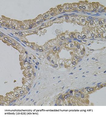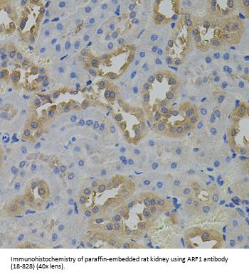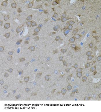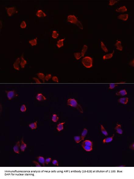 ADP-ribosylation factor 1 (ARF1) is a member of the human ARF gene family. The family members encode small guanine nucleotide-binding proteins that stimulate the ADP-ribosyltransferase activity of cholera toxin and play a role in vesicular trafficking as activators of phospholipase D. The gene products, including 6 ARF proteins and 11 ARF-like proteins, constitute a family of the RAS superfamily. The ARF proteins are categorized as class I (ARF1, ARF2 and ARF3), class II (ARF4 and ARF5) and class III (ARF6), and members of each class share a common gene organization. The ARF1 protein is localized to the Golgi apparatus and has a central role in intra-Golgi transport. Multiple alternatively spliced transcript variants encoding the same protein have been found for this gene.