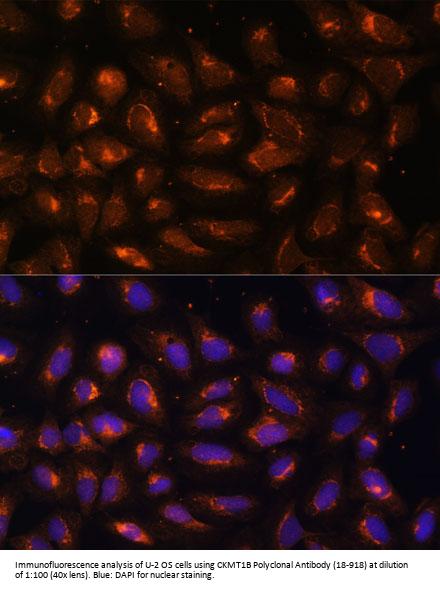 Mitochondrial creatine (MtCK) kinase is responsible for the transfer of high energy phosphate from mitochondria to the cytosolic carrier, creatine. It belongs to the creatine kinase isoenzyme family. It exists as two isoenzymes, sarcomeric MtCK and ubiquitous MtCK, encoded by separate genes. Mitochondrial creatine kinase occurs in two different oligomeric forms: dimers and octamers, in contrast to the exclusively dimeric cytosolic creatine kinase isoenzymes. Many malignant cancers with poor prognosis have shown overexpression of ubiquitous mitochondrial creatine kinase; this may be related to high energy turnover and failure to eliminate cancer cells via apoptosis. Ubiquitous mitochondrial creatine kinase has 80% homology with the coding exons of sarcomeric mitochondrial creatine kinase. Two genes located near each other on chromosome 15 have been identified which encode identical mitochondrial creatine kinase proteins.