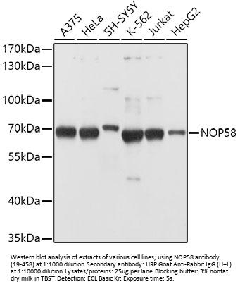 Recombinant fusion protein containing a sequence corresponding to amino acids 360-529 of human NOP58 (NP_057018.1).