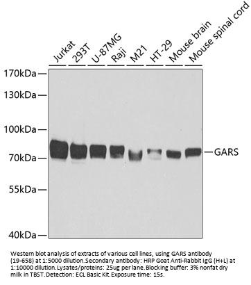 This gene encodes glycyl-tRNA synthetase, one of the aminoacyl-tRNA synthetases that charge tRNAs with their cognate amino acids. The encoded enzyme is an (alpha)2 dimer which belongs to the class II family of tRNA synthetases. It has been shown to be a target of autoantibodies in the human autoimmune diseases, polymyositis or dermatomyositis. Two transcript variants encoding different isoforms have been found for this gene.