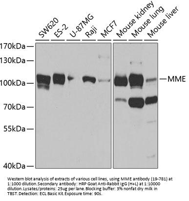 This gene encodes a common acute lymphocytic leukemia antigen that is an important cell surface marker in the diagnosis of human acute lymphocytic leukemia (ALL). This protein is present on leukemic cells of pre-B phenotype, which represent 85% of cases of ALL. This protein is not restricted to leukemic cells, however, and is found on a variety of normal tissues. It is a glycoprotein that is particularly abundant in kidney, where it is present on the brush border of proximal tubules and on glomerular epithelium. The protein is a neutral endopeptidase that cleaves peptides at the amino side of hydrophobic residues and inactivates several peptide hormones including glucagon, enkephalins, substance P, neurotensin, oxytocin, and bradykinin. This gene, which encodes a 100-kD type II transmembrane glycoprotein, exists in a single copy of greater than 45 kb. The 5' untranslated region of this gene is alternatively spliced, resulting in four separate mRNA transcripts. The coding region is not affected by alternative splicing.