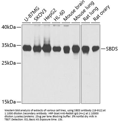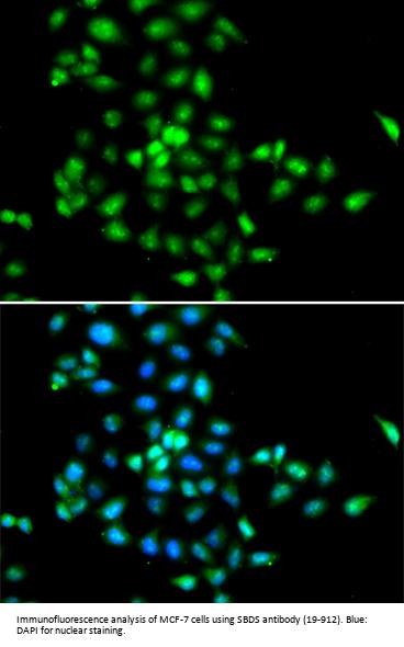 Recombinant fusion protein containing a sequence corresponding to amino acids 1-250 of human SBDS (NP_057122.2).