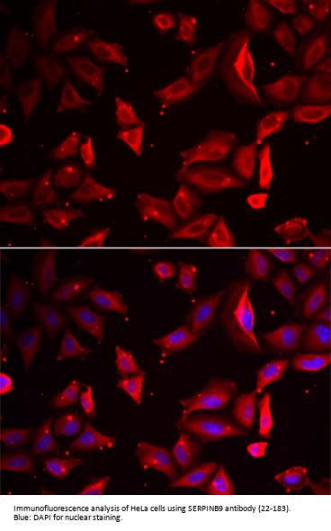 Recombinant fusion protein containing a sequence corresponding to amino acids 1-376 of human SERPINB9 (NP_004146.1).