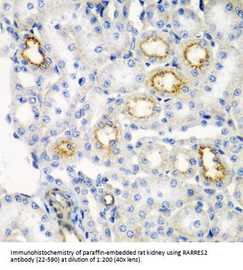 Recombinant fusion protein containing a sequence corresponding to amino acids 17-163 of human RARRES2 (NP_002880.1).