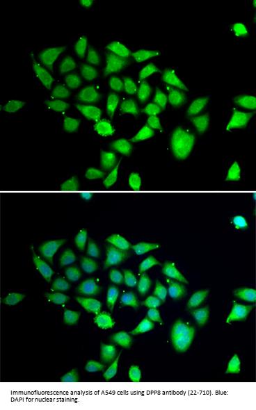 Recombinant fusion protein containing a sequence corresponding to amino acids 10-230 of human DPP8 (NP_932065.1).