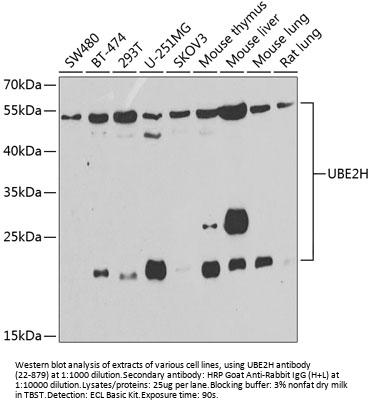 The modification of proteins with ubiquitin is an important cellular mechanism for targeting abnormal or short-lived proteins for degradation. Ubiquitination involves at least three classes of enzymes: ubiquitin-activating enzymes, or E1s, ubiquitin-conjugating enzymes, or E2s, and ubiquitin-protein ligases, or E3s. This gene encodes a member of the E2 ubiquitin-conjugating enzyme family. The encoded protein sequence is 100% identical to the mouse homolog and 98% identical to the frog and zebrafish homologs. Three alternatively spliced transcript variants have been found for this gene and they encode distinct isoforms.