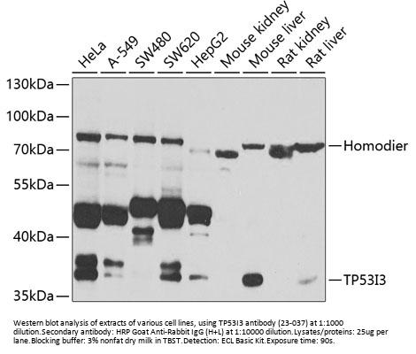 Recombinant fusion protein containing a sequence corresponding to amino acids 163-332 of human TP53I3 (NP_671713.1).