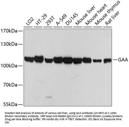 A synthetic peptide corresponding to a sequence within amino acids 350-450 of human GAA (NP_000143.2).