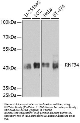 Recombinant fusion protein containing a sequence corresponding to amino acids 1-220 of human RNF34 (NP_079402.2).