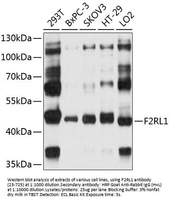 Coagulation factor II (thrombin) receptor-like 1 (F2RL1) is a member of the large family of 7-transmembrane-region receptors that couple to guanosine-nucleotide-binding proteins. F2RL1 is also a member of the protease-activated receptor family. It is activated by trypsin, but not by thrombin. It is activated by proteolytic cleavage of its extracellular amino terminus. The new amino terminus functions as a tethered ligand and activates the receptor. The F2RL1 gene contains two exons and is widely expressed in human tissues. The predicted protein sequence is 83% identical to the mouse receptor sequence.