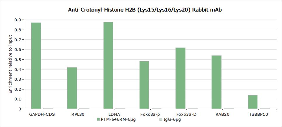 Histones are subject to a variety of enzyme catalyzed modifications, including acetylation, methylation, phosphorylation, ubiquitylation, etc. Crotonylation of lysine is a newly identified reversible modification controlling chromosome structure and gene transcription. The reversible lysine crotonylation has been well demonstrated in eukaryotic histones from worm to human. The unique structure and genomic localization of histone lysine crotonylation suggest that it is mechanistically and functionally different from histone lysine acetylation. Specifically, in both human somatic and mouse male germ cell genomes, histone crotonylation marks either active promoters or potential enhancers. This antibody can simultaneously identify histone H3 at Lys15, 16 and 20.