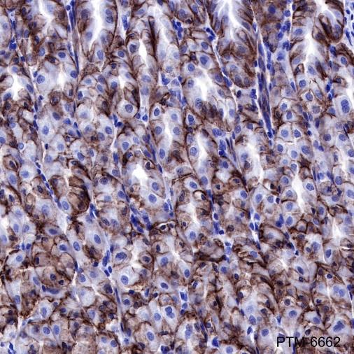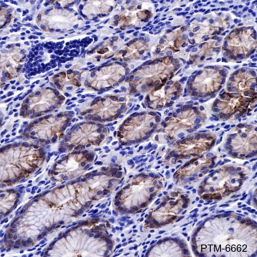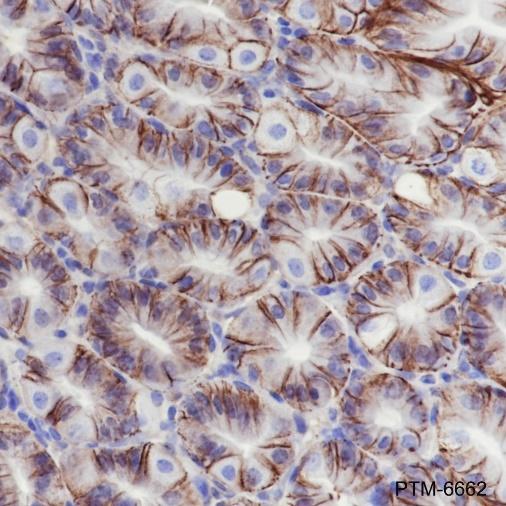 Claudin 18 (CLDN18) belongs to the large claudin family of proteins, which are tetraspan transmembrane proteins of tight junctions. Claudins exhibit specific patterns of expression in different tissues. CLDN18 is specifically expressed in the stomach and lung. CLDN18 has two alternatively spliced variants, CLDN18.1 and CLDN18.2. CLDN18.2 is a highly selective gastric lineage marker that determines the gastric phenotype in a neoplastic condition, whereas CLDN18.1 is lung specific. Altered CLDN18 expression has been reported in various human malignancies, including gastric cancer, lung adenocarcinoma, and pancreatic neoplasm.