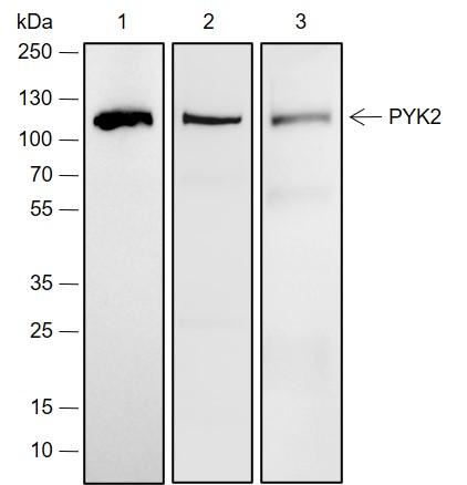 Protein tyrosine kinase PYK2, also called CAKβ, RAFTK and CADTK, is a nonreceptor tyrosine kinase structurally related to focal adhesion kinase (FAK). PYK2 is predominantly expressed in cells derived from hematopoietic lineages and in the central nervous system. PYK2 is one of the signaling mediators for the G-protein-coupled receptors and MAP kinase signaling pathway. It plays an important role in cell spreading and migration.