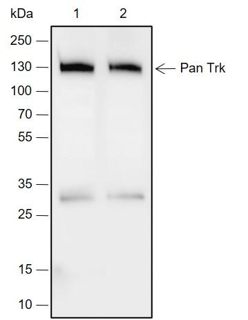 The family of Trk receptor tyrosine kinases consists of TrkA, TrkB, and TrkC. While the sequence of these family members is highly conserved, they are activated by different neurotrophins: TrkA by NGF, TrkB by BDNF or NT4, and TrkC by NT3. Neurotrophin signaling through these receptors regulates a number of physiological processes, such as cell survival, proliferation, neural development, and axon and dendrite growth and patterning. In the adult nervous system, the Trk receptors regulate synaptic strength and plasticity. TrkA regulates proliferation and is important for development and maturation of the nervous system. Phosphorylation at Tyr490 is required for Shc association and activation of the Ras-MAP kinase cascade. Residues Tyr674/675 lie within the catalytic domain, and phosphorylation at these sites reflects TrkA kinase activity. Point mutations, deletions, and chromosomal rearrangements (chimeras) cause ligand-independent receptor dimerization and activation of TrkA. TrkA is activated in many malignancies including breast, ovarian, prostate, and thyroid carcinomas. Research studies suggest that expression of TrkA in neuroblastomas may be a good prognostic marker as TrkA signals growth arrest and differentiation of cells originating from the neural crest.