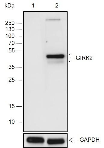 GIRK2 is a member of G protein-coupled inwardly rectifying potassium channel family proteins (GIRKs). GIRK family proteins allow potassium to flow into the cell and therefore control cellular excitability in the central nervous system, heart, and pancreas. Activation of most GIRK channels requires heterologous subunit assembly and the presence of ATP. GIRK2 is abundantly expressed in the brain, where it is involved in pain perception. It is also required for peripheral opioid-mediated analgesia. Additionally GIRK2 localizes to pancreatic β cells and regulates insulin secretion. Mutations in the KCNJ6 gene encoding GIRK2 are associated with Keppen-Lubinsky Syndrome, a rare disease characterized by severe developmental delay, facial dysmorphism, and intellectual disability.