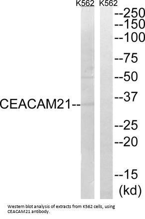 Rabbit polyclonal antibody against CEACAM21 protein. Immunogen region is Internal.