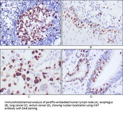 Ki67, also known as MKI67, it is the prototypic cell cycle related nuclear protein, expressed by proliferating cells in all phases of the active cell cycle (G1, S, G2 and M phase).It is absent in resting (G0) cells.Ki67 antibodies are useful in establishing the cell growing fraction in neoplasms (immunohistochemically quantified by determining the number of Ki67 positive cells among the total number of resting cells = Ki67 index).In neoplastic tissues the prognostic value is comparable to the tritiated thymidine labelling index.The correlation between low Ki67 index and histologically low grade tumours is strong.Ki67 is routinely used as a neuronal marker of cell cycling and proliferation.