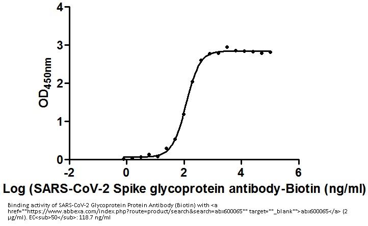 Severe Acute Respiratory Syndrome Coronavirus 2 (SARS-CoV-2/COVID-19) Spike Glycoprotein Antibody is a chimaeric recombinant antibody conjugated to Biotin for the detection of SARS-CoV-2/COVID-19 S Protein. This antibody is expressed in HEK293 cells and contains Mouse scFv and C-terminal Human IgG1 Fc tag.The SARS-CoV-2 Spike Protein (S protein) is a viral protein that allows the entry of SARS-CoV-2 into human cells. The protein forms trimers on the viral capsid and binds to human Angiotensin Converting Enzyme 2 (ACE2) located on the cell surface. The protein has a cleavage site between the S1 and S2 subunits that is targeted by the human enzyme Furin, and it may also cause the development of a syncytium (cell fusion). Antibodies to S protein can prevent viral entry as well as target the virus for further immune action.