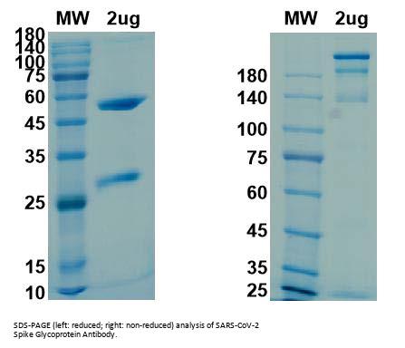 SARS-CoV-2/COVID-19 Spike Glycoprotein Antibody is a chimaeric recombinant Monoclonal antibody expressed in CHO cells against SARS-CoV-2 Spike Glycoprotein, containing Mouse variable region and Human IgG1 Kappa constant region.The SARS-CoV-2 Spike Protein (S protein) is a viral protein that allows the entry of SARS-CoV-2 into human cells. The protein forms trimers on the viral capsid and binds to human Angiotensin Converting Enzyme 2 (ACE2) located on the cell surface. The protein has a cleavage site between the S1 and S2 subunits that is targeted by the human enzyme Furin, and it may also cause the development of a syncytium (cell fusion). Antibodies to S protein can prevent viral entry as well as target the virus for further immune action.