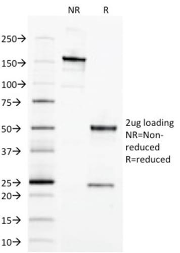 Higher concentration may be required for direct detection using primary antibody conjugates than for indirect detection with secondary antibody|Immunofluorescence: 1-2 ug/mL|Immunohistology (formalin): 0.5-1 ug/mL|Staining of formalin-fixed tissues requires boiling tissue sections in 10 mM citrate buffer, pH 6.0, for 10-20 min followed by cooling at RT for 20 min|Flow Cytometry 0.5-1 ug/million cells/0.1 mL|Optimal dilution for a specific application should be determined by user