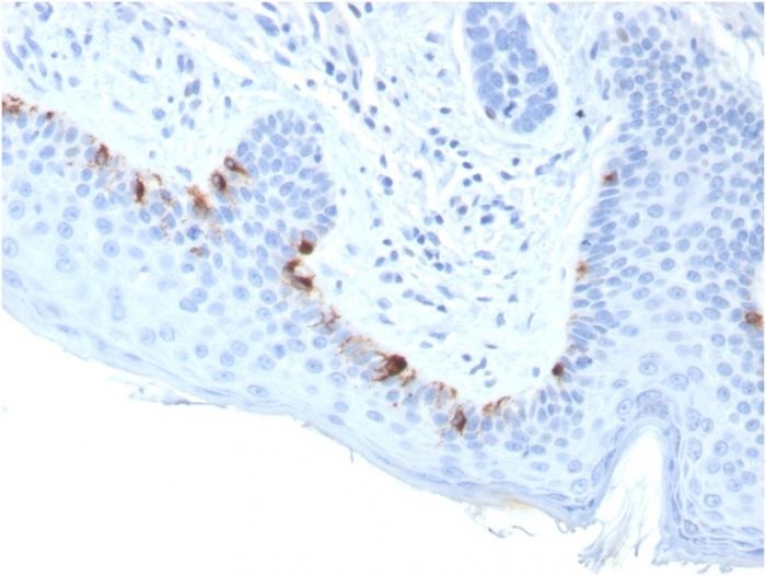 Reacts with a 75 kDa melanocyte-specific gene product, identified as Tyrosinase-related protein-1 (TRP-1). It is involved in melanin synthesis. TRP1 is present on the melanosomal membranes of melanoma, normal melanocytes and nevi. Recent evidence suggests that TRP-1 is involved in maintaining stability of tyrosinase protein and modulating its catalytic activity. TRP-1 is also involved in maintenance of melanosome ultrastructure and affects melanocyte proliferation and cell death. Primary antibodies are available purified, or with a selection of fluorescent CF® Dyes and other labels. CF® Dyes offer exceptional brightness and photostability. Note: Conjugates of blue fluorescent dyes like CF®405S and CF®405M are not recommended for detecting low abundance targets, because blue dyes have lower fluorescence and can give higher non-specific background than other dye colors.