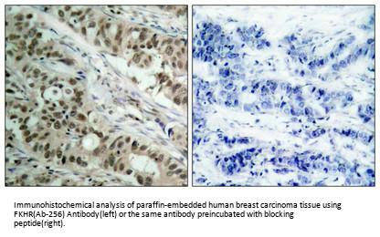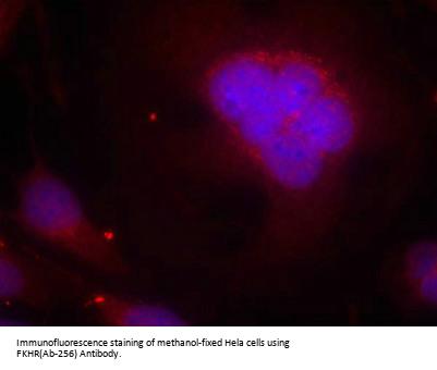 FKHR belongs to the forkhead family of transcription factors, which are characterized by a distinct forkhead domain. It may play a role in myogenic growth and differentiation. The mammalian DAF-16-like transcription factors, FKHR, FKHRL1, and AFX, function as key regulators of insulin signaling, cell cycle progression, and apoptosis downstream of phosphoinositide 3-kinase. Gene activation through binding to insulin response sequences has been essential for mediating these functions. D-type Cyclins (in Class III) is required for FKHR mediated inhibition of cell cycle progression and transformation. FKHR gene is mapped to chromosome 13q14 Gan L, et al. (2005) J Neurochem, 93(5): 1209-19. Smith WW, et al. (2005) J Cell Biol, 169(2): 331-9. Di Maira G, et al. (2005) Cell Death Differ, 12(6): 668-77. Horn S, et al. (2004) Leukemia, 18(11): 1839-49. Zhao X, et al. (2004) Biochem J 4, 378(Pt 3): 839-49.
