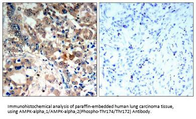 Catalytic subunit of AMP-activated protein kinase (AMPK), an energy sensor protein kinase that plays a key role in regulating cellular energy metabolism. In response to reduction of intracellular ATP levels, AMPK activates energy-producing pathways and inhibits energy-consuming processes: inhibits protein, carbohydrate and lipid biosynthesis, as well as cell growth and proliferation. AMPK acts via direct phosphorylation of metabolic enzymes, and by longer-term effects via phosphorylation of transcription regulators. Also acts as a regulator of cellular polarity by remodeling the actin cytoskeleton, probably by indirectly activating myosin. Regulates lipid synthesis by phosphorylating and inactivating lipid metabolic enzymes such as ACACA, ACACB, GYS1, HMGCR and LIPE, regulates fatty acid and cholesterol synthesis by phosphorylating acetyl-CoA carboxylase (ACACA and ACACB) and hormone-sensitive lipase (LIPE) enzymes, respectively. Regulates insulin-signaling and glycolysis by phosphorylating IRS1, PFKFB2 and PFKFB3. AMPK stimulates glucose uptake in muscle by increasing the translocation of the glucose transporter SLC2A4/GLUT4 to the plasma membrane, possibly by mediating phosphorylation of TBC1D4/AS160. Regulates transcription and chromatin structure by phosphorylating transcription regulators involved in energy metabolism such as CRTC2/TORC2, FOXO3, histone H2B, HDAC5, MEF2C, MLXIPL/ChREBP, EP300, HNF4A, p53/TP53, SREBF1, SREBF2 and PPARGC1A. Acts as a key regulator of glucose homeostasis in liver by phosphorylating CRTC2/TORC2, leading to CRTC2/TORC2 sequestration in the cytoplasm. In response to stress, phosphorylates 'Ser-36' of histone H2B (H2BS36ph), leading to promote transcription. Acts as a key regulator of cell growth and proliferation by phosphorylating TSC2, RPTOR and ATG1: in response to nutrient limitation, negatively regulates the mTORC1 complex by phosphorylating RPTOR component of the mTORC1 complex and by phosphorylating and activating TSC2. In response to nutrient limitation, promotes autophagy by phosphorylating and activating ULK1. AMPK also acts as a regulator of circadian rhythm by mediating phosphorylation of CRY1, leading to destabilize it. May regulate the Wnt signaling pathway by phosphorylating CTNNB1, leading to stabilize it. Also has tau-protein kinase activity: in response to amyloid beta A4 protein (APP) exposure, activated by CAMKK2, leading to phosphorylation of MAPT/TAU, however the relevance of such data remains unclear in vivo. Also phosphorylates CFTR, EEF2K, KLC1, NOS3 and SLC12A1.