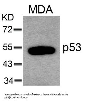 p53 is a nuclear protein which plays an essential role in the regulation of cell cycle specifically in the transition from G0 to G1. It is found in very low levels in normal cells however in a variety of transformed cell lines in high amounts and believed to contribute to transformation and malignancy. The open reading frame of p53 is 393 amino acids long, with the central region (consisting of amino acids from about 100 to 300) containing the DNA-binding domain. This proteolysis-resistant core is flanked by a C-terminal end mediating oligomerization and an N-terminal end containing a strong transcription activation signal. p53 binds as a tetramer to a PBS (p53-Binding Site) and activates the expression of downstream genes that inhibit growth and/or invasion. p53 binds as a tetramer to a p53-binding site (PBS) and to activate the expression of adjacent genes that inhibit growth and/or invasion. Deletion of one or both p53 alleles reduces the expression of tetramers, resulting in decreased expression of the growth inhibitory genes Lin T, et al. (2005) Nat Cell Biol, 7(2): 165-71. Vega FM, et al. (2004) Mol Cell Biol, 24(23): 10366-80. Li J, et al. (2004) J Biol Chem, 279(40): 41275-9. Wang J, et al. (2004) J Biol Chem, 279(38): 39584-92.