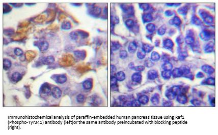 Serine/threonine-protein kinase that acts as a regulatory link between the membrane-associated Ras GTPases and the MAPK/ERK cascade, and this critical regulatory link functions as a switch determining cell fate decisions including proliferation, differentiation, apoptosis, survival and oncogenic transformation. RAF1 activation initiates a mitogen-activated protein kinase (MAPK) cascade that comprises a sequential phosphorylation of the dual-specific MAPK kinases (MAP2K1/MEK1 and MAP2K2/MEK2) and the extracellular signal-regulated kinases (MAPK3/ERK1 and MAPK1/ERK2). The phosphorylated form of RAF1 (on residues Ser-338 and Ser-339, by PAK1) phosphorylates BAD/Bcl2-antagonist of cell death at 'Ser-75'. Phosphorylates adenylyl cyclases: ADCY2, ADCY5 and ADCY6, resulting in their activation. Phosphorylates PPP1R12A resulting in inhibition of the phosphatase activity. Phosphorylates TNNT2/cardiac muscle troponin T. Can promote NF-kB activation and inhibit signal transducers involved in motility (ROCK2), apoptosis (MAP3K5/ASK1 and STK3/MST2), proliferation and angiogenesis (RB1). Can protect cells from apoptosis also by translocating to the mitochondria where it binds BCL2 and displaces BAD/Bcl2-antagonist of cell death. Regulates Rho signaling and migration, and is required for normal wound healing. Plays a role in the oncogenic transformation of epithelial cells via repression of the TJ protein, occludin (OCLN) by inducing the up-regulation of a transcriptional repressor SNAI2/SLUG, which induces down-regulation of OCLN. Restricts caspase activation in response to selected stimuli, notably Fas stimulation, pathogen-mediated macrophage apoptosis, and erythroid differentiation.David R. Hodge, J. Biol. Chem., Jun 1998, 273: 15727. Michael A. Beazely, Mol. Pharmacol., Jan 2005, 67: 250 - 259. Deanna G. Adams, J. Biol. Chem., Dec 2005, 280: 42644 - 42654. Antonino Colanzi, J. Cell Biol., Apr 2003, 161: 27.