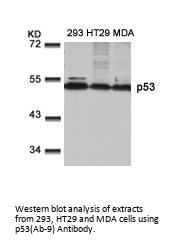 p53 is a nuclear protein which plays an essential role in the regulation of cell cycle specifically in the transition from G0 to G1. It is found in very low levels in normal cells however in a variety of transformed cell lines in high amounts and believed to contribute to transformation and malignancy. The open reading frame of p53 is 393 amino acids long, with the central region (consisting of amino acids from about 100 to 300) containing the DNA-binding domain. This proteolysis-resistant core is flanked by a C-terminal end mediating oligomerization and an N-terminal end containing a strong transcription activation signal. p53 binds as a tetramer to a PBS (p53-Binding Site) and activates the expression of downstream genes that inhibit growth and/or invasion. p53 binds as a tetramer to a p53-binding site (PBS) and to activate the expression of adjacent genes that inhibit growth and/or invasion. Deletion of one or both p53 alleles reduces the expression of tetramers, resulting in decreased expression of the growth inhibitory genes Ito, A. et al. (2001) EMBO J. 20, 1331-1340. Sakaguchi, K. et al. (1998) Genes Dev. 12, 2831-2841. Solomon, J.M. et al. (2006) Mol. Cell. Biol. 26, 28-38.