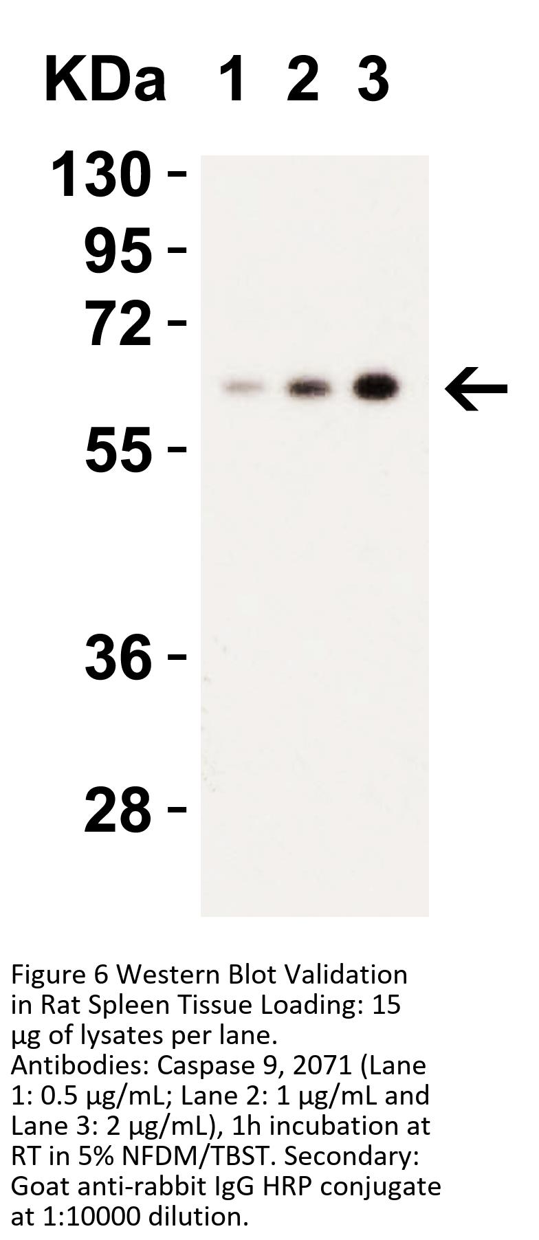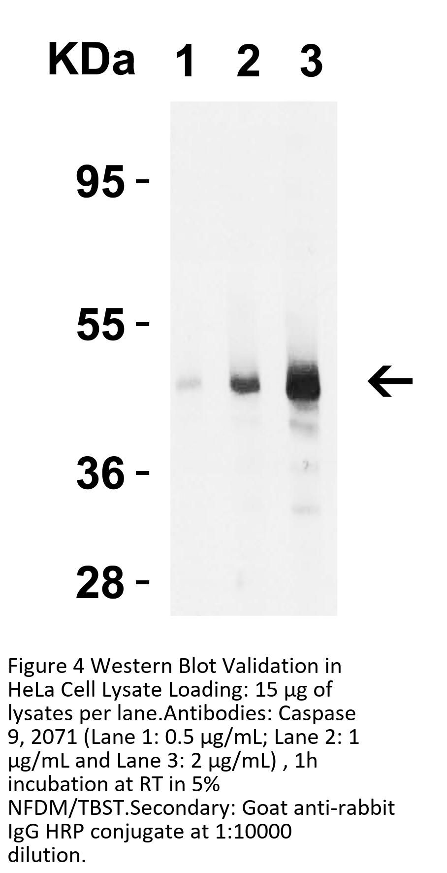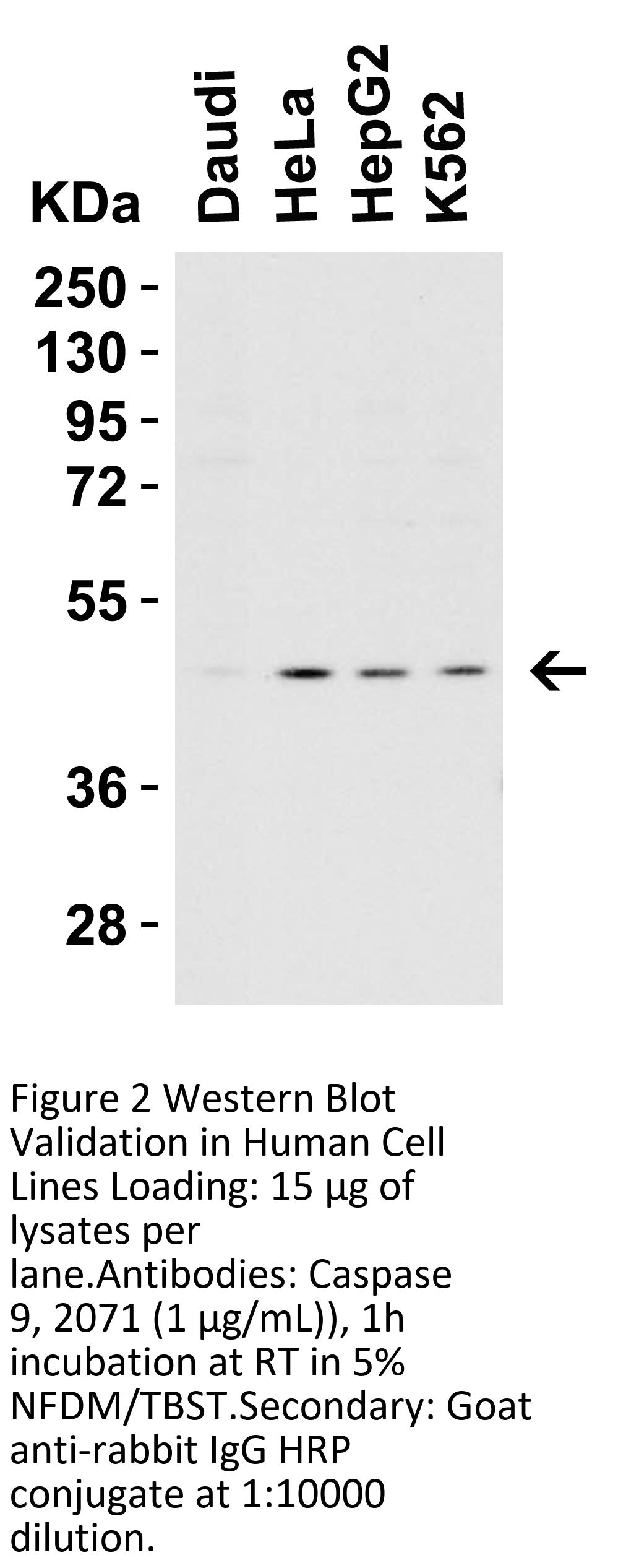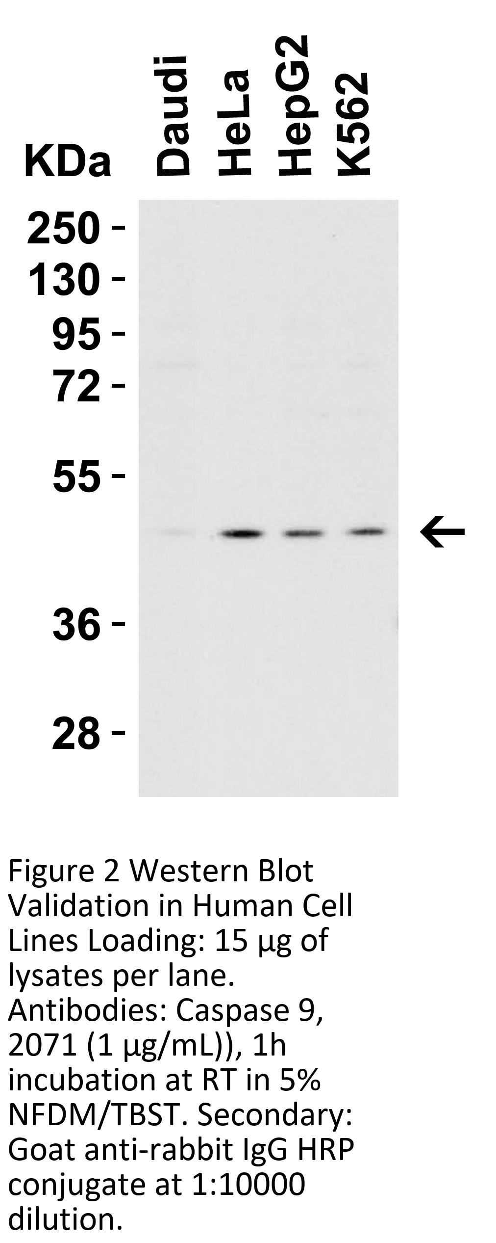 Independent Antibody Validation in Cell lines (Figure 1) shows similar Caspase 9 expression profile in human cell lines detected by two independent anti-Caspase 9 antibodies that recognize different epitopes, 2071 against N-terminus domain and 2073 against central domain. Caspase 9 proteins are detected in the most tested cell lines at different expression levels by the two independent antibodies.