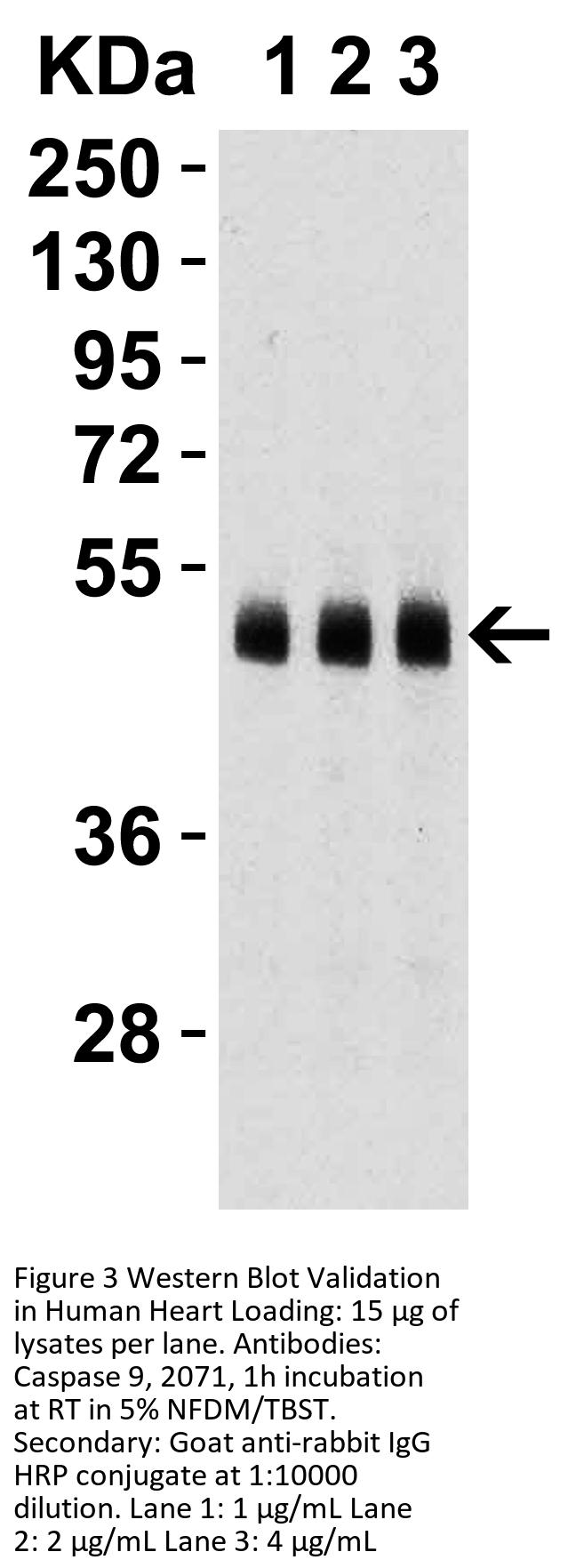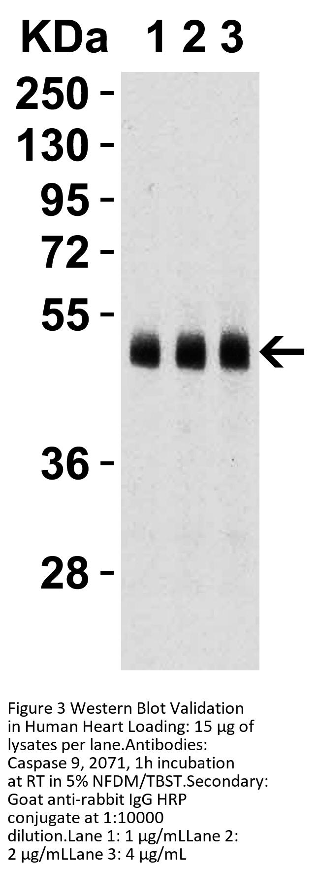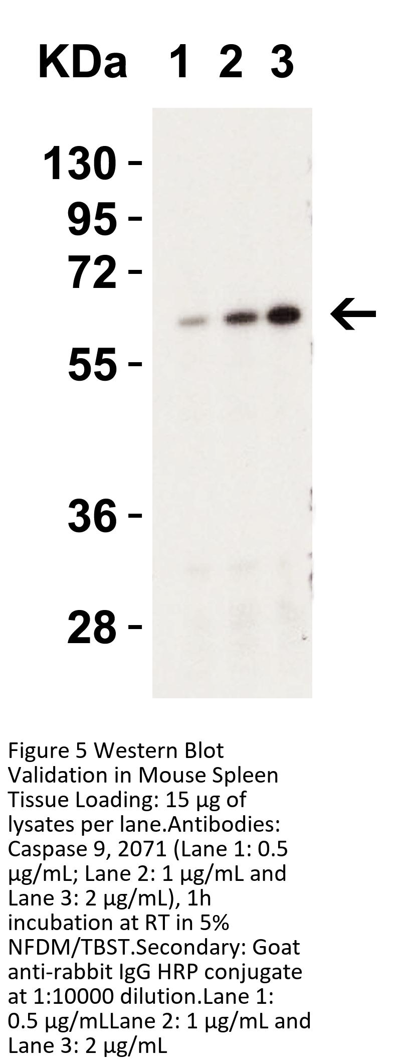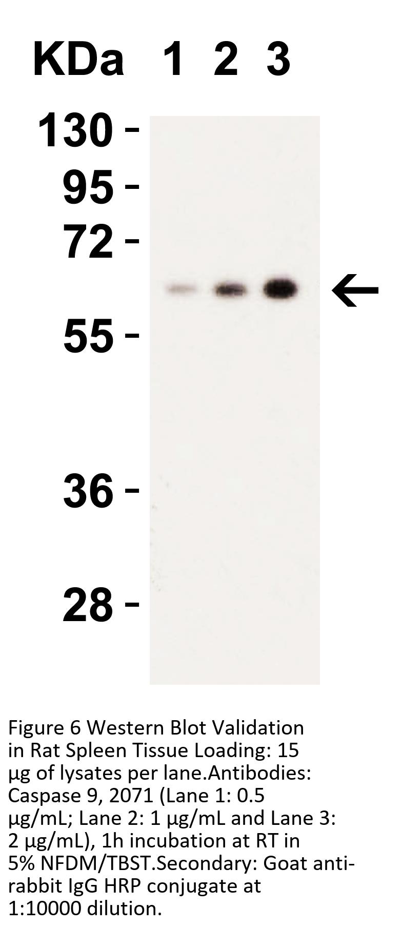 Independent Antibody Validation in Cell lines (Figure 1) shows similar Caspase 9 expression profile in human cell lines detected by two independent anti-Caspase 9 antibodies that recognize different epitopes, 2071 against N-terminus domain and 2073 against central domain. Caspase 9 proteins are detected in the most tested cell lines at different expression levels by the two independent antibodies.