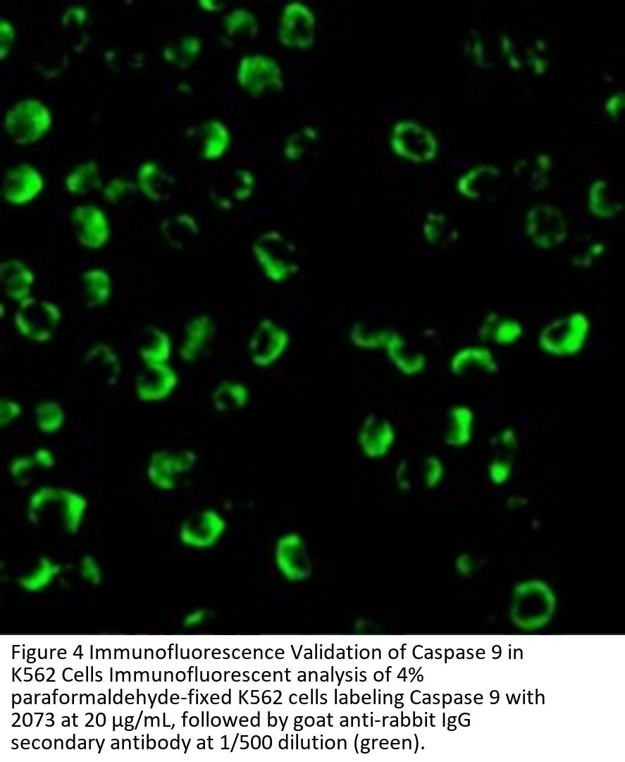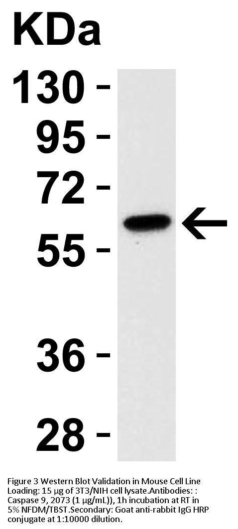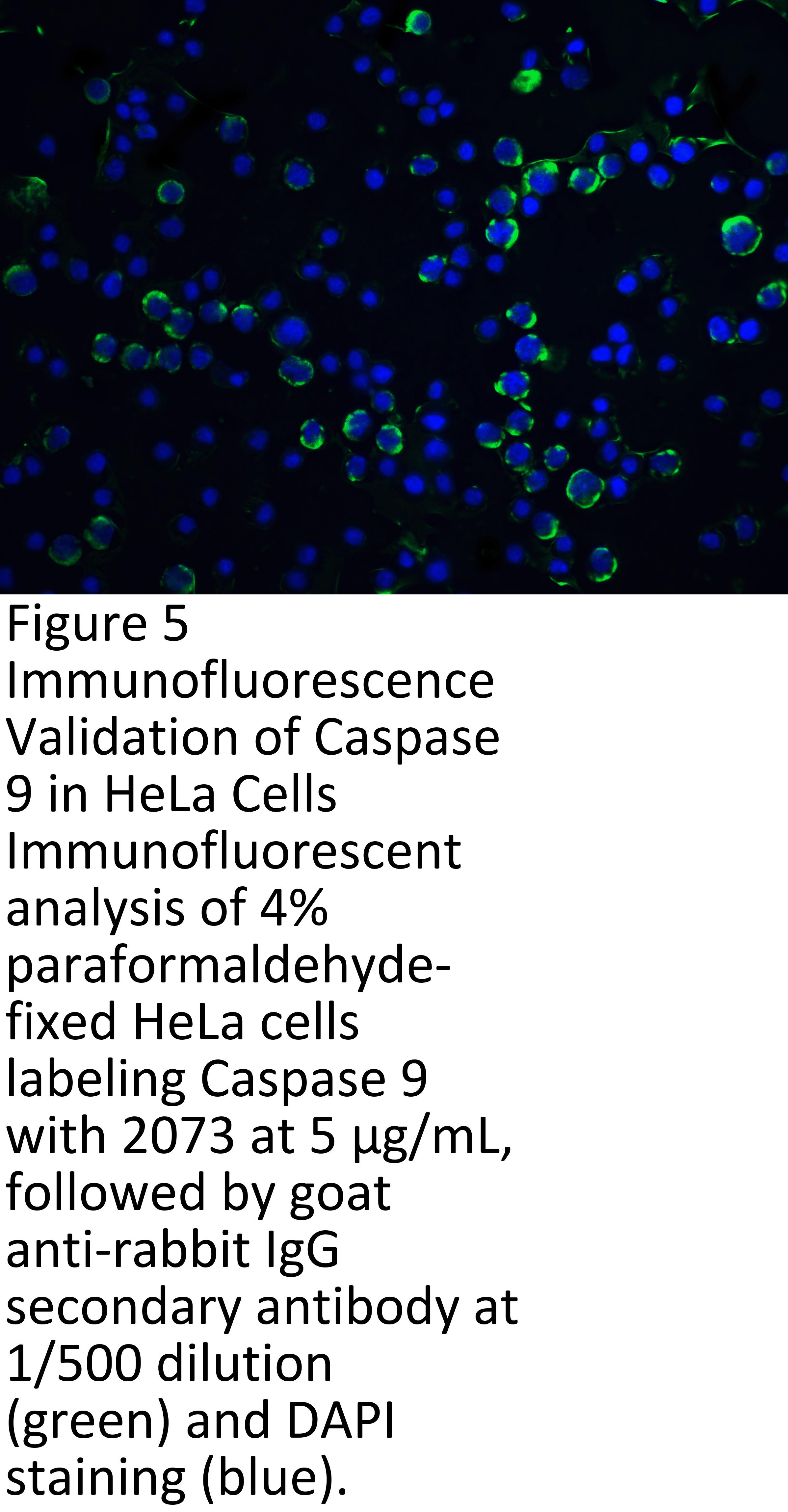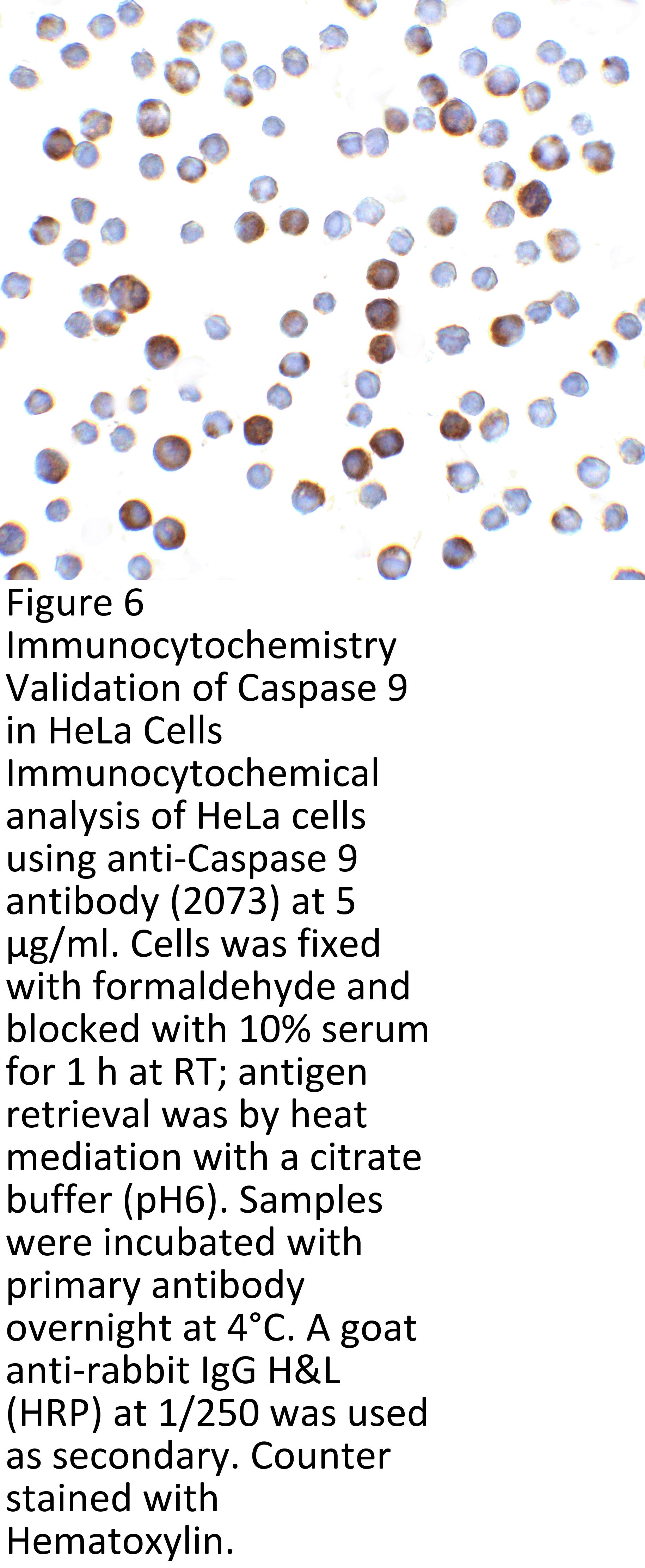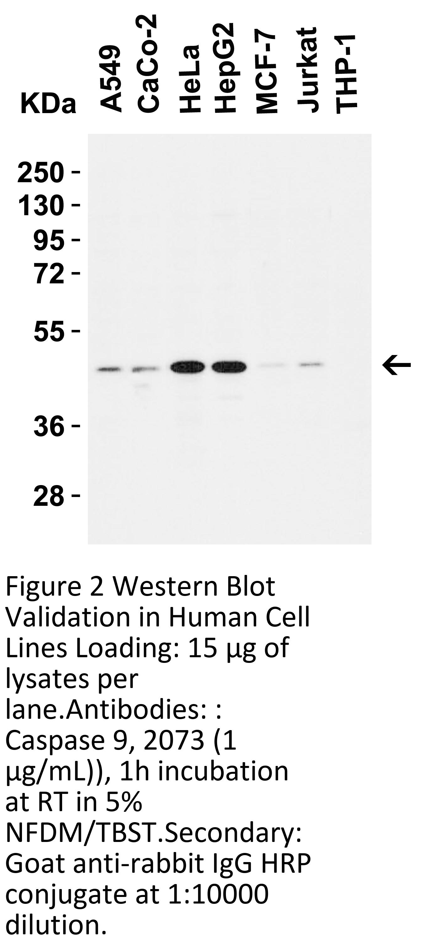 Independent Antibody Validation in Cell lines (Figure 1) shows similar CASPASE 9 expression profile in human cell lines detected by two independent anti-CASPASE 9 antibodies that recognize different epitopes, 2071 against N-terminus domain and 2073 against central domain. CASPASE 9 proteins are detected in the most tested cell lines at different expression levels by the two independent antibodies.