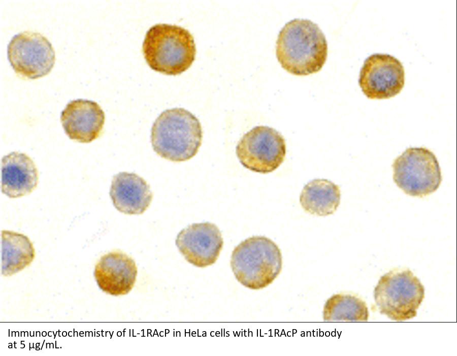 IL-1RAcP antibody can be used for detection of IL-1RAcP by Western blot 1 μ g/mL. Antibody can also be used for immunocytochemistry starting at 5 μ g/mL.