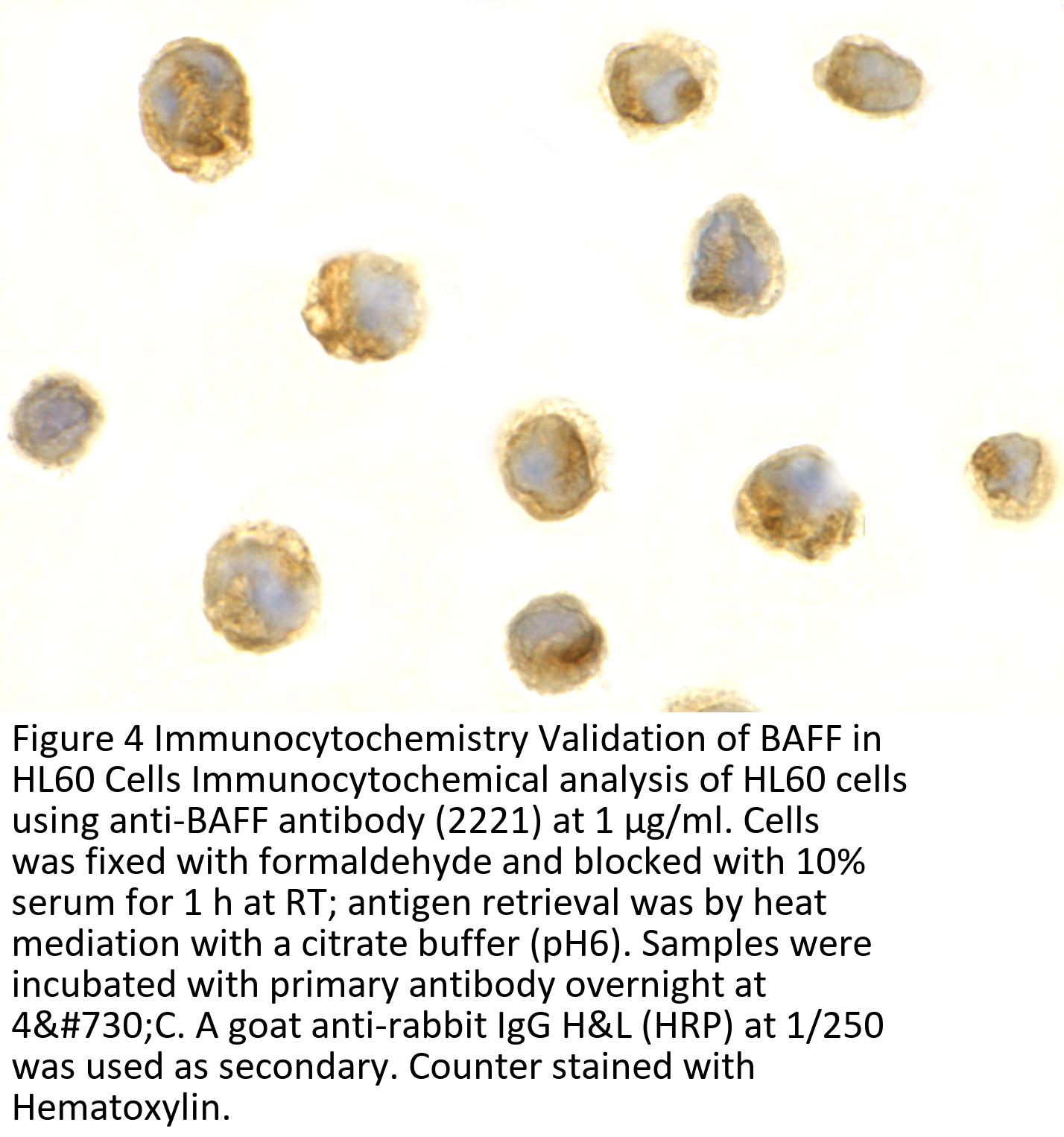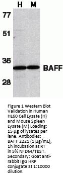 BAFF Antibody is supplied in PBS containing 0.02% sodium azide.