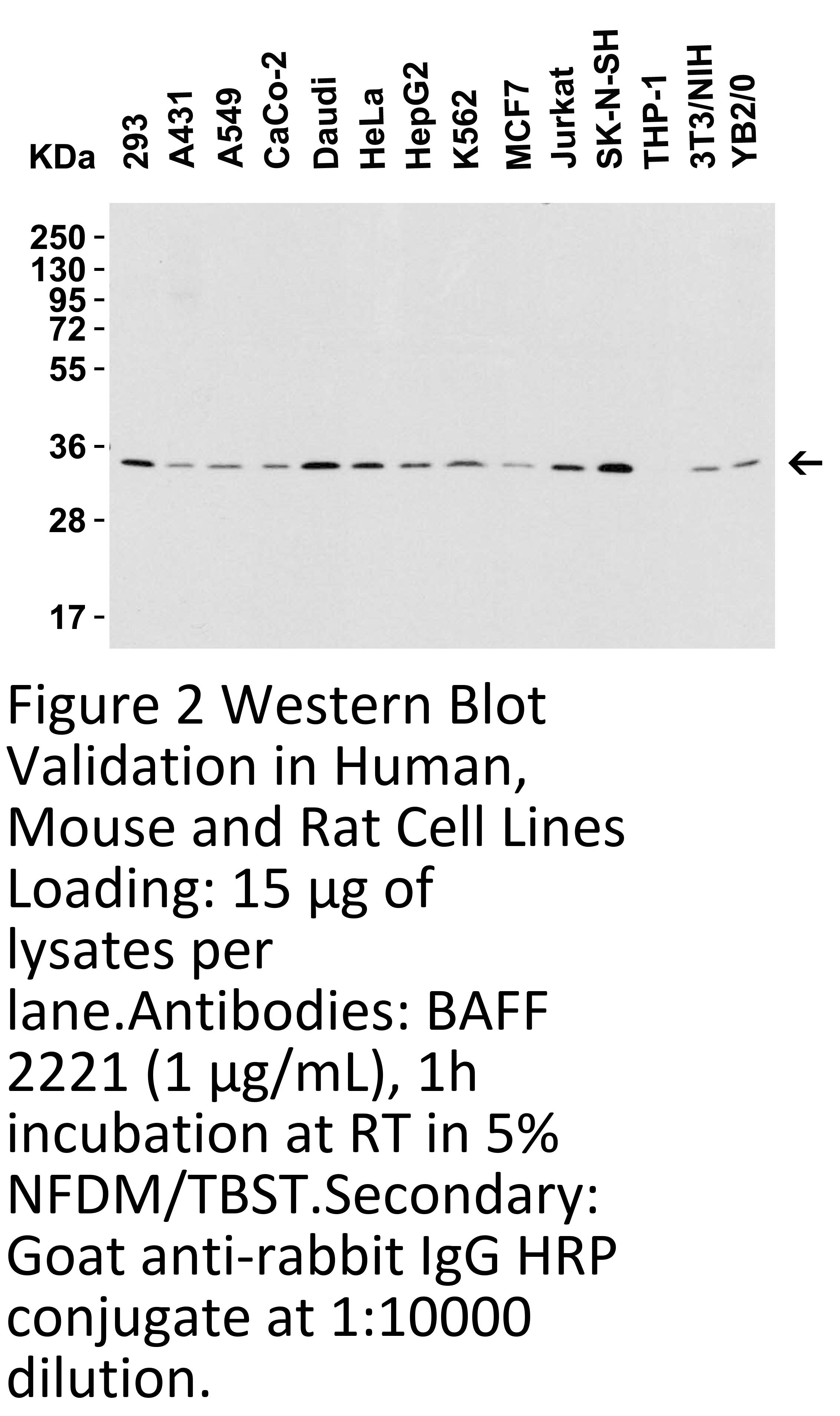 Human BAFF has 3 isoforms, including isoform 1 (285aa, 31kD), isoform 2 (266aa, 29kD) and isoform 3 (164aa, 17.6kD). Mouse BAFF has 2 isoforms, including isoform 1 (309aa, 34kD) and isoform 2 (290aa, 32kD). Rat BAFF has only one isoform (274aa, 30kD). 2221 can detect two longer human isoforms, mouse and rat.
