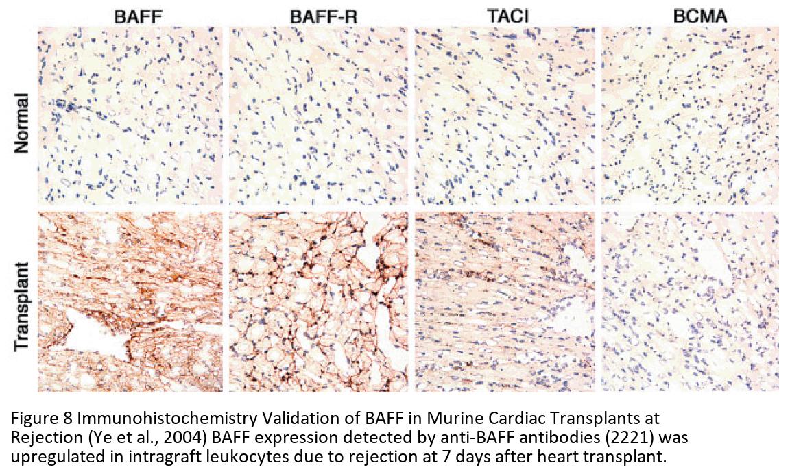 Regulated expression validation (Figure 6-8): BAFF expression detected by anit-BAFF antibodies (2221) was up-regulated   in patients with myloma or Graves’ disease or in murine transplanted heart.