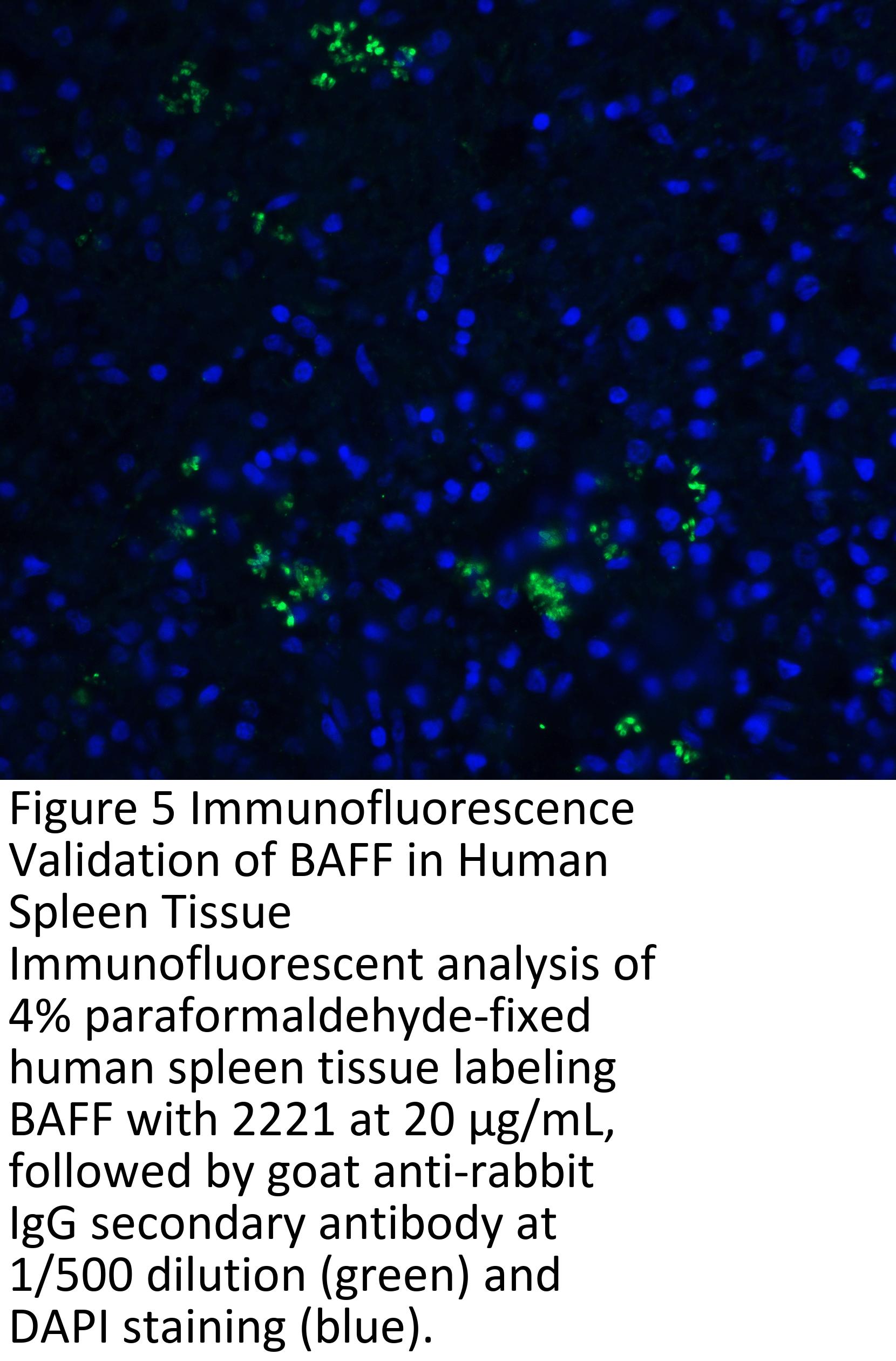 Anti-BAFF antibody (2221) was raised against a peptide corresponding to 16 amino acids near the carboxy terminus of human BAFF.